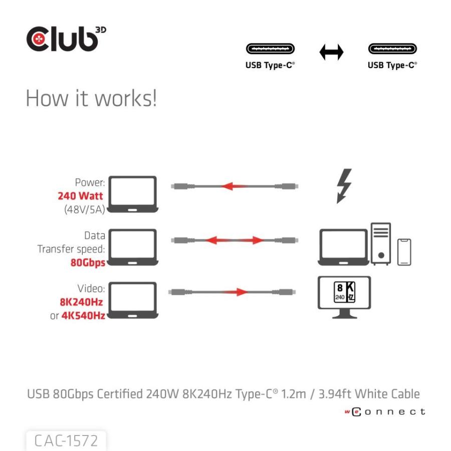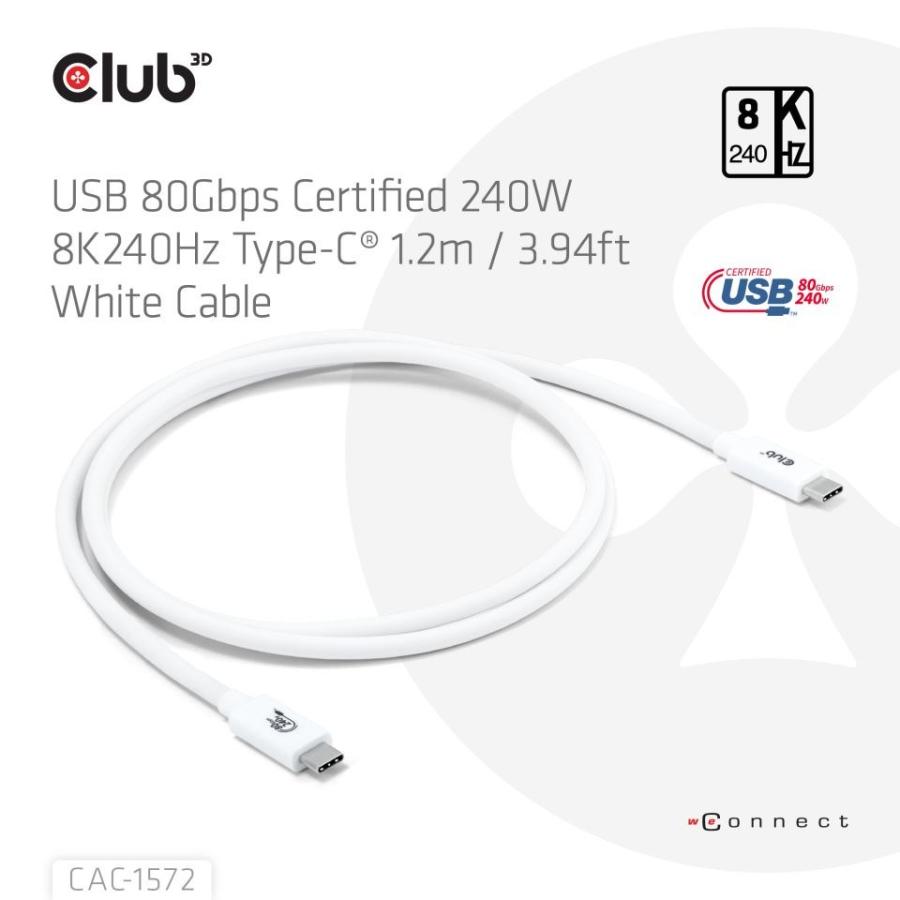Club3D Kabel USB4 Typ-C, 80Gbps, Certifikovaný, 4K540Hz, 8K240Hz, 16K60Hz, PD 240W, biely