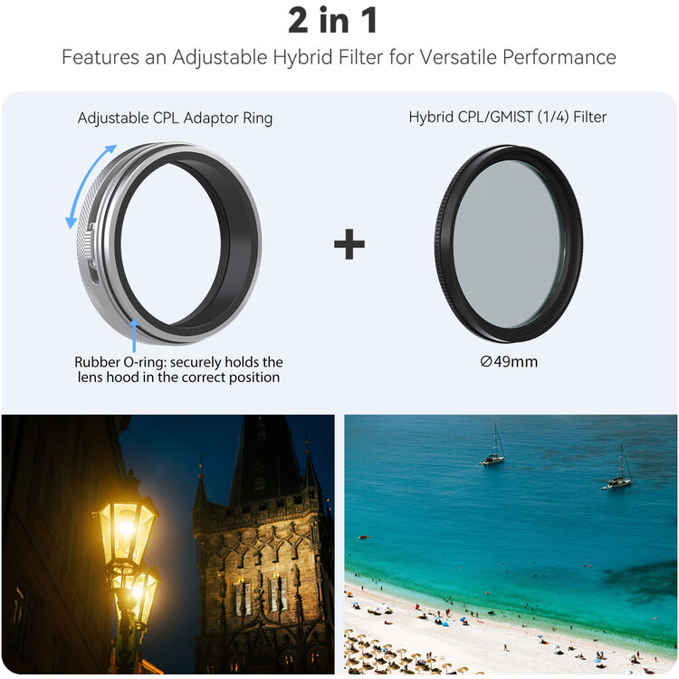 Súprava obsahuje unikátny hybridný filter, ktorý v sebe kombinuje funkciu polarizačného filtra (CPL) a Black Diffusion Mist 1/4. Výsledkom je snímka bez rušivých odleskov, s intenzívnejšími farbami a jemným filmovým závojom, ktorý dodáva fotografiám aj videám profesionálny nádych. Tento filter je ideálny pre portréty, krajinárske snímky aj kreatívne filmové zábery.