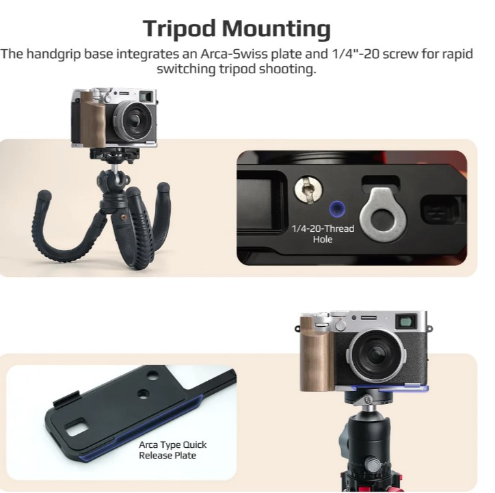 Držiak L Bracket pre Fuji X100VI kombinuje odolnosť a jednoduché používanie s kompatibilitou s Arca-Swiss pre rýchlu výmenu statívu. Jeho vstavaná rukoväť a skrutka 1/4"-20 zaisťujú stabilitu a zároveň umožňujú plný prístup k batérii a pamäťovej karte.