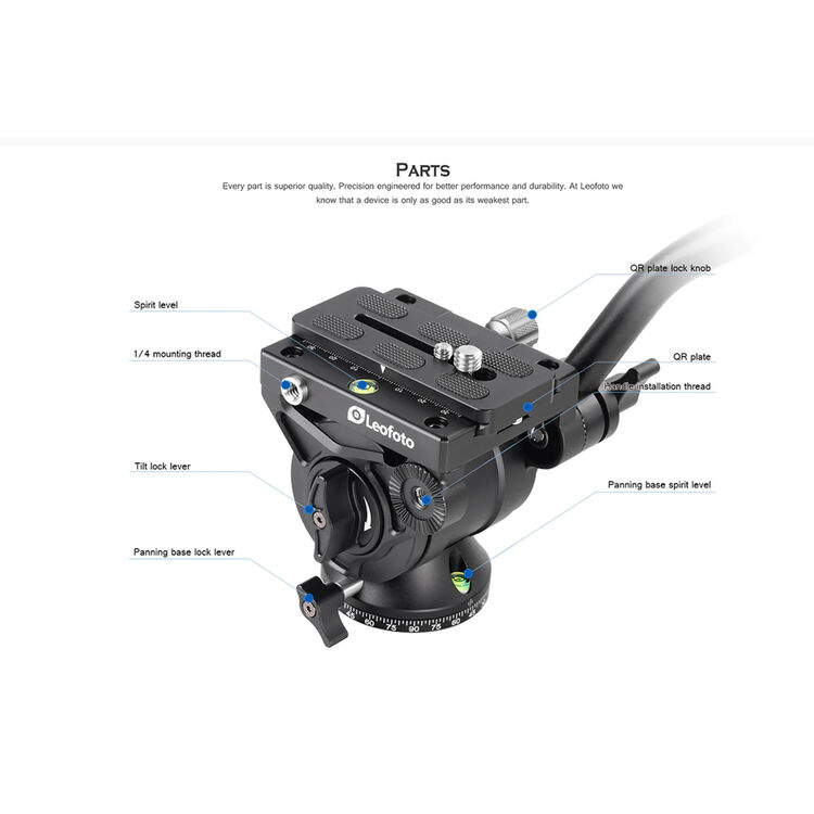 Fluidná videohlava Leofoto je ideálna na použitie s videokamerami a digitálnymi zrkadlovkami. Hlava je opatrená bezpečnostným systémom proti vyšmyknutiu, ktorý je zhodný pre všetky hlavy Leofoto. Hlava pracuje jemne, jej pohyb je nastaviteľný a ovládanie je intuitívne. Pre presné nastavenie hlavy do horizontálnej polohy je opatrená dvoma nivelačnými libelami.