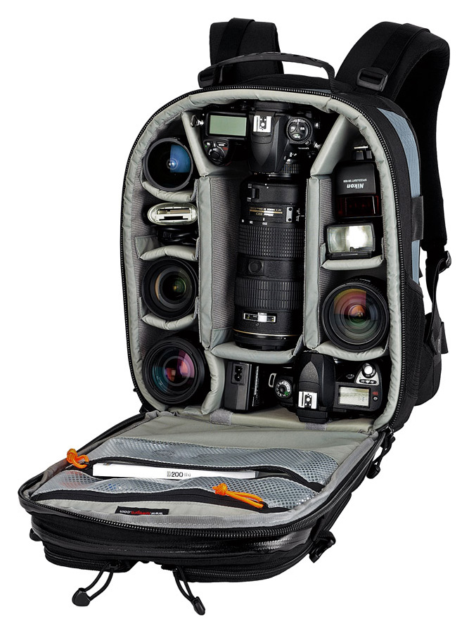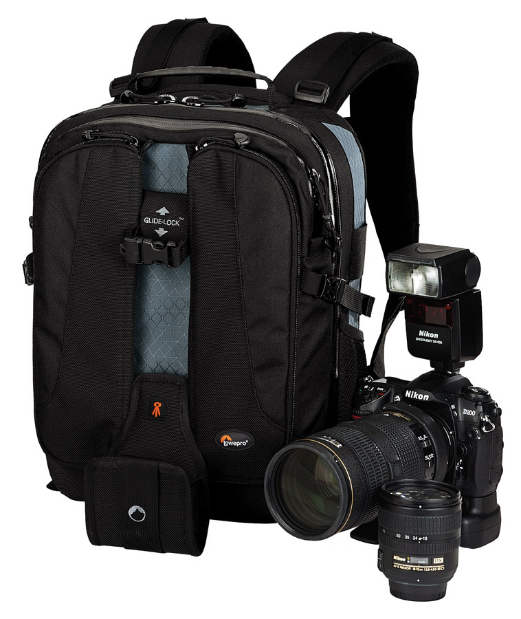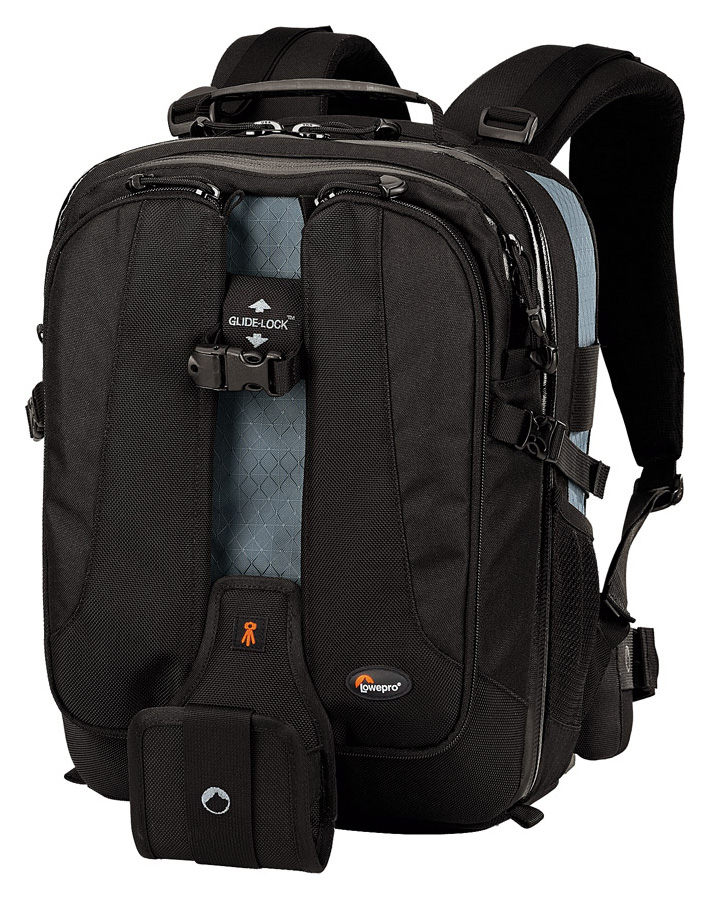 Unikátny, nastaviteľný systém Lowepro Glide-Lock™ slúži pre efektívne uchytenie príslušenstva ako napr. statív, alebo outdoor vybavenie. Na jeho zadnej strane sa nachádzajú dve veľké vertikálne vrecká pre pamäťové karty, filtre a inú drobnú výbavu. Hneď za nimi sa nachádza veľké stredové vrecko určené pre bezpečné uloženie notebooku. Vnútorný priestor hlavnej fotokomory je vybavený sadou oddeľovacích priečok na suchý zips, vďaka ktorým si môžete rozdeliť fotokomoru podľa vašich individuálnych potrieb. Vonkajší materiál batohu je mimoriadne odolný a vodovzdorný. Pre nosenie v naozaj veľmi nepriaznivom počasí je vybavený integrovanou pláštenkou All Weather Cover™ na ochranu pred extrémnymi klimatickými podmienkami.