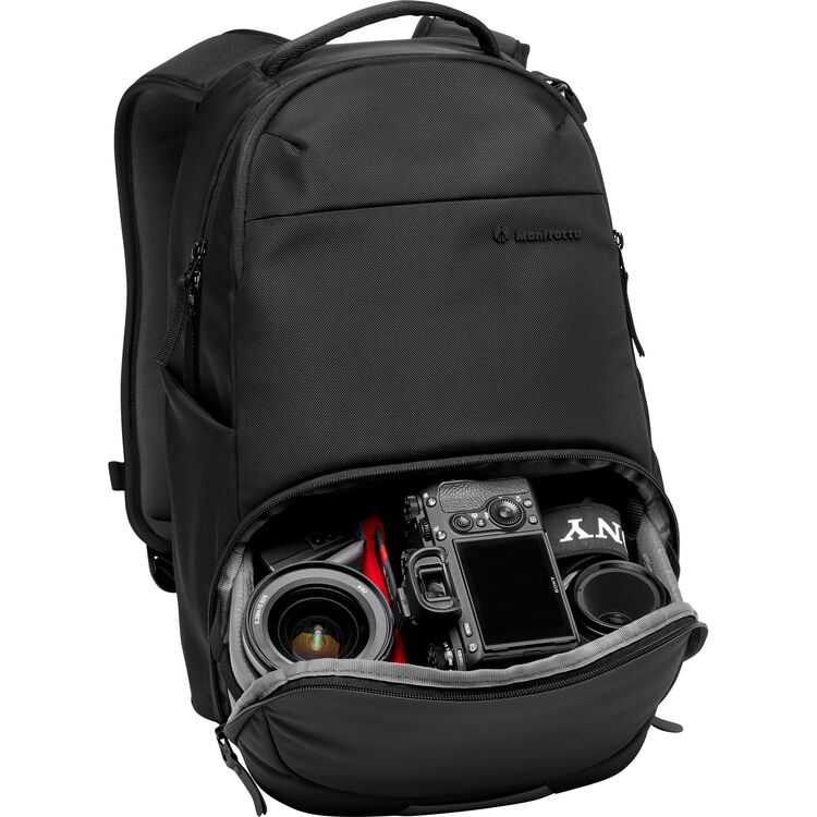Nový dvojkomorový batoh Manfrotto Advanced 3 camera Activ disponuje vyhradeným úložným priestorom pre uloženie osobých vecí vo vrchnej časi, a priestorom v spodnej časti s rýchlym prísupom spredu pre uloženie vášho fotografického zariadenia.
