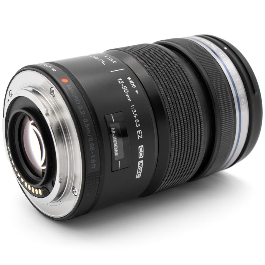 Objektív Olympus M.ZD ED 12-50mm f/3.5-6.3 EZ MSC poskytuje 4,16x zväčšenie a rozsah ohniskových vzdialeností je 24-100mm (ekvivalent u 35mm fotoaparátu) pri svetelnosti f/3.5-5.6. Tento univerzálny objektív vám umožňuje fotografovanie štandardných scén od krajinárskych záberov po portréty. Optická sústava pozostáva z 10-tich šošoviek zoradených do 9-tich skupín a obsahuje 2 asféricky tvarované šošovky, ktoré sa starajú o dokonalú kresbu bez skreslenia obrazu v krajoch. Okrem nich sú použité aj 1 DSA šošovka, 1 šošovka zo super HR skla a 1 šošovka zo špeciáneho nízko rozptylového ED skla. Najkratšia vzdialenosť na ktorú dokáže objektív zaostriť 20cm umožňuje vyfotografovať atraktívne detailné fotografie menších objektov pri maximálnom zväčšení 0,36x. Elektromagneticky ovládaná clona je zložená z 5 tvarovaných lamiel a stará sa o atraktívne prirodzené podanie rozostrených častí obrazu (bokeh). Predný člen objektívu sa pri zoomovaní a zaostrovaní neotáča, čo uľahčuje použitie prechodových a polarizačných filtrov pričom priemer filtrového závitu je 52mm. Telo objektívu je dokonale utesnené proti stekajúcej vode a prachu. Objektív je 83mm dlhý a má 57mm na priemer, pričom váži iba 211g.