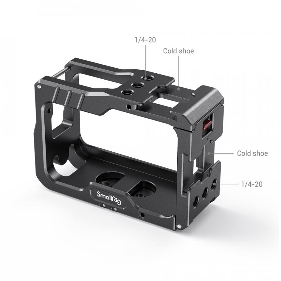 Kameru jednoducho zasuňte do klietky z boku a stlačením krytu zaistite na danom mieste. Klietka je vybavená dvoma studenými topánkami a niekoľkými otvormi so závitom 1/4 ”-20 pre upevnenie príslušenstva, napríklad mikrofónom alebo malým LED svetlom.
