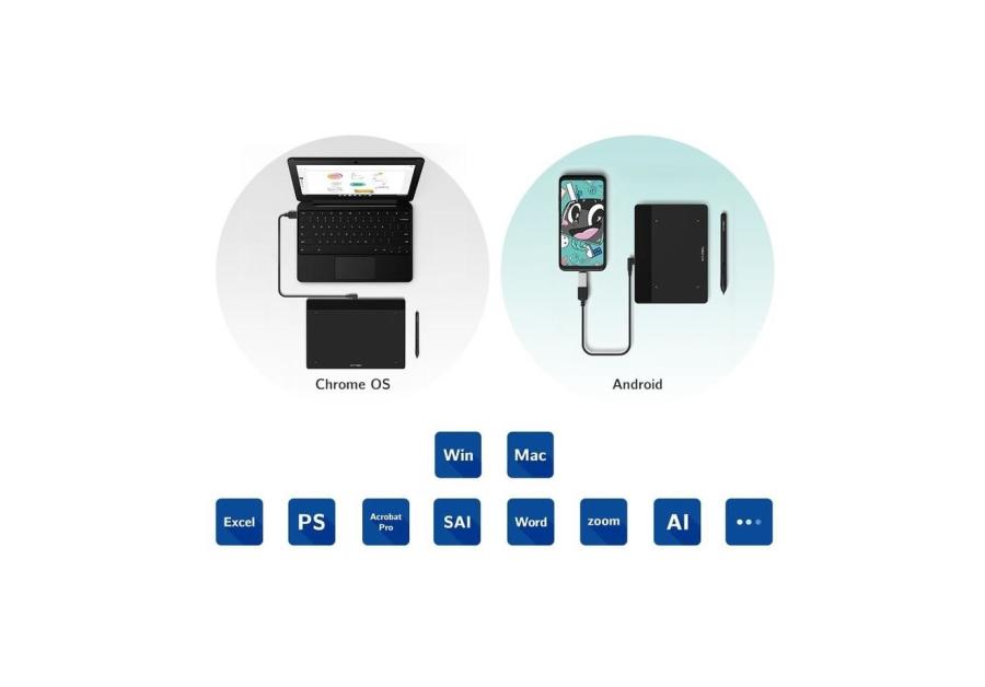 Tablet je kompatibilný s notebookmi a počítačmi so systémom Windows 7 (alebo novším, podporuje WIN 11), Mac OS X 10.10 (alebo novším, podporuje macOS Monterey), Chrome OS 88 (alebo novším, nemusí dobre fungovať s niektorými skladacími/od­nímateľnými Chromebookmi), Linux.